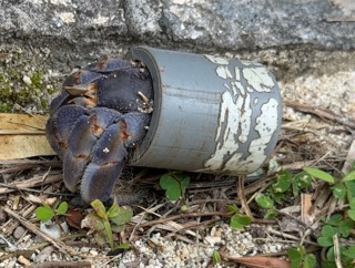 人の手が残したものを上手に使いながら生きているヤシガニの姿。なんか逞しい!