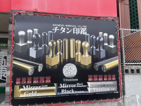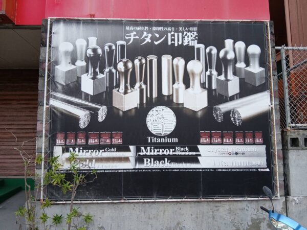 施工前と施工後を比べると、チタン印鑑のゴールドの色合いが復活して、フレームの赤色も鮮やかになり、店頭が明るくなったように見えます。